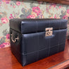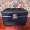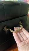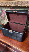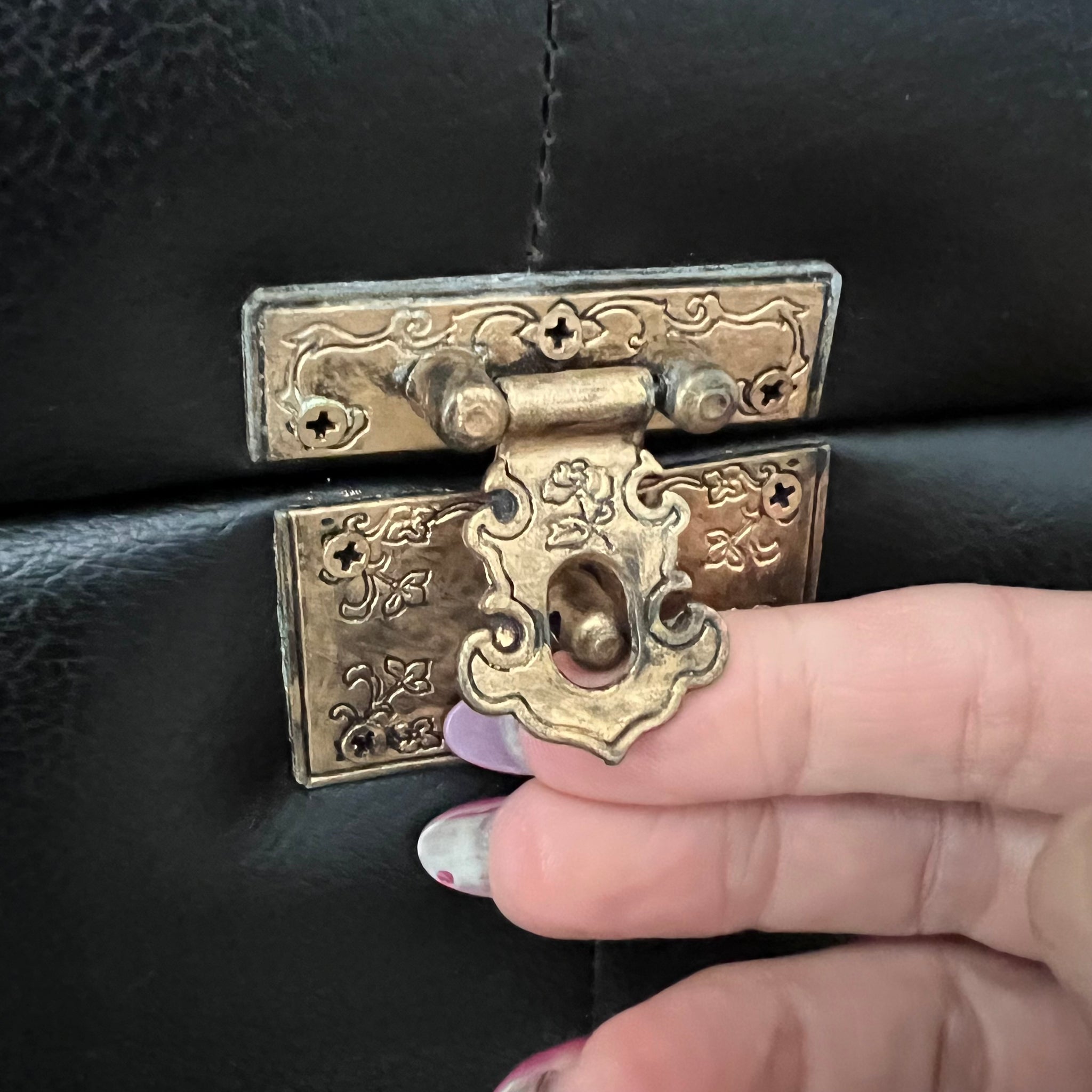 Very elegant faux leather wooden box with gilt ornate metal double handles and clasp. The interior has a beautiful brown velvet lining in excellent condition! 13.5x8.5x9H
